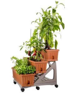 • 3 plantenbakken van 80 cm, de enige die op drie treden groeit om alle planten beter aan de zon te laten wennen en die van de vloer af staat voor een betere functionaliteit