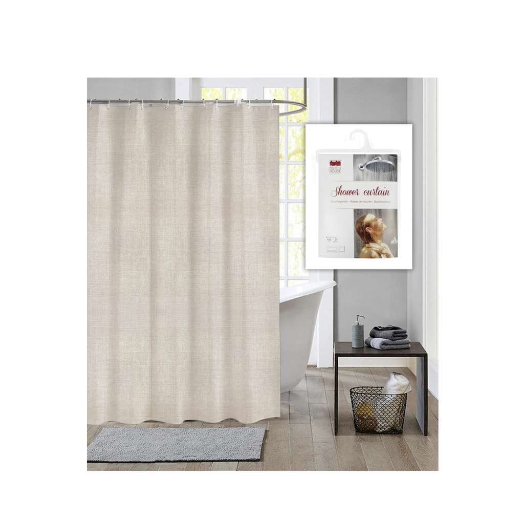 Dit Dutch House douchegordijn heeft een stijlvolle linnen print. Het geeft je interieur een luxere uitstraling en zorgt ervoor dat je badkamer droog blijft tijdens een douchebeurt. Trendy én praktisch! Het douchegordijn is waterafstotend en voorzien van 12 ringen en een loodveter. Materiaal: 100% polyester. Afmeting: 180 x 200 cm. Geschikt voor de wasmachine (max. 40 graden).