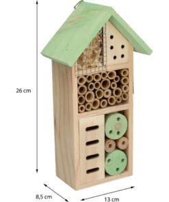 Het insectenhotel draagt bij aan het ecosysteem van uw tuin en heeft ook nog eens een mooie uitstraling. Insecten zorgen voor een belangrijk biologisch evenwicht in de natuur. De insecten zijn van groot belang voor de natuur en helpen een handje mee in het milieu. Vaak hebben de dieren in de tuin minder overwinterplekken waar ze zich kunnen nestelen. Een insectenhotel is een prachtige schuilplaats voor Bijen, Hommels, Vlinders en Spinnen. Het insectenhotel is voorzien van een handig ophanghaakje zodat u het hotel op een stabiele en veilige plek op kan hangen.