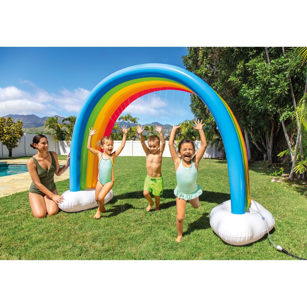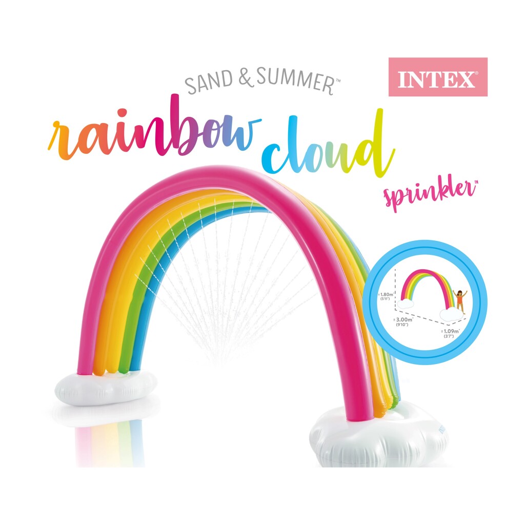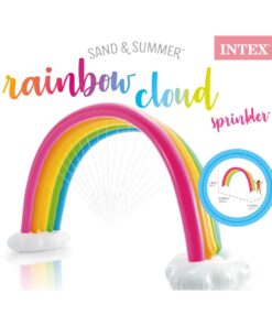 Deze kleurrijkeIntex 56597NP regenboogsproeier is op warme zomerdagen een hoogtepunt in elke tuin. Uw kinderen spelen in de tuin en willen afkoelen? De regenboogsproeier is in een mum van tijd opgeblazen, sluit dan de tuinslang aan en draai het water open. De sproeier laat nu het koele water van bovenaf regenen! Het water dat uit de regenboog sproeit, vormt een gordijn van water, wat erg leuk is. In de basis van de regenboogsproeier bevinden zich twee waterkamers met grote, afsluitbare openingen. Deze kunnen bijvoorbeeld gevuld worden met een gieter en bieden de sproeier een stabielere stand. Houd er rekening mee dat de kamers gevuld zijn voordat de luchtkamers worden opgeblazen. De regenboogsproeier is gemaakt van duurzaam en milieuvriendelijk PVC-materiaal. Afmetingen: 300 x 109 x 180 cm. Geschikt voor kinderen vanaf 3 jaar.