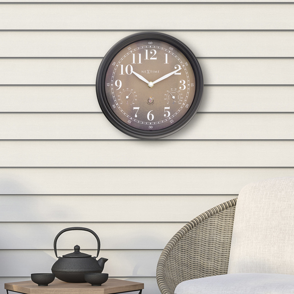 DeNeXtime NE-4318BR buitenklok Jasmine verteld meer dan alleen de tijd. Deze wandklok heeft namelijk ook een thermometer op de index welke de temperatuur in Celsius weergeeft en geeft de luchtvochtigheid aan. Deze klok heeft subtiele zwarte rand met een koperkleur gemeleerde wijzerplaat met een duidelijke witte cijfer en streep index. Het gebruik van extra rubberen ringen om te voorkomen dat het water de kwetsbare delen van de klok bereikt, maakt deze klok bijzonder en weerbestendig. De klok is geschikt voor zowel binnen als buiten en werkt op 1x AA-batterij (niet inbegrepen). Diameter: 23,5 cm.