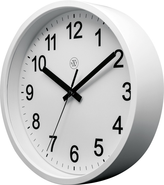 Witte kunststof wandklok met witte wijzerplaat, glijdende secondewijzer en arabische cijfers. Diameter 25,5cm. Stil uurwerk. Deze klok werkt op 1 AA batterij (niet bijgeleverd).