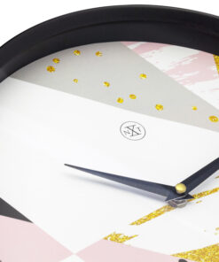 Wandklok kunststof Ø 30 cm. Design opdruk in de kleuren creme, zwart, goud, grijs en roze. Stil zwart uurwerk. Zwarte omlijsting. Deze klok werkt op 1 AA batterij (niet bijgeleverd).