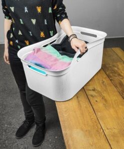 Wasmand uitgevoerd in een subtiele, abstracte metal look. Het flexibele materiaal en de afgeronde hoeken bieden veiligheid en stabiliteit tijdens het dragen. Inhoud 41 liter.