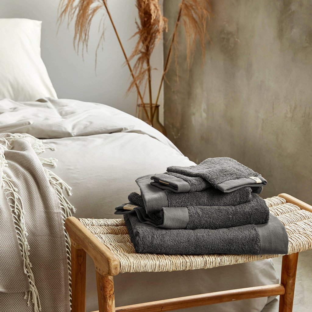 Omhul jezelf met het fijne badlaken van 60 x 110 cm gemaakt van 70% gerecycled katoen en 30% nieuw katoen. Door de fijne structuur geniet je dagelijks van een heerlijk zacht badlaken. Deze is afgewerkt met een sobere, elegante boord en voorzien van een handige ophanglus. Stijlvol en duurzaam! Op40 graden wassen. Kleur: antraciet.